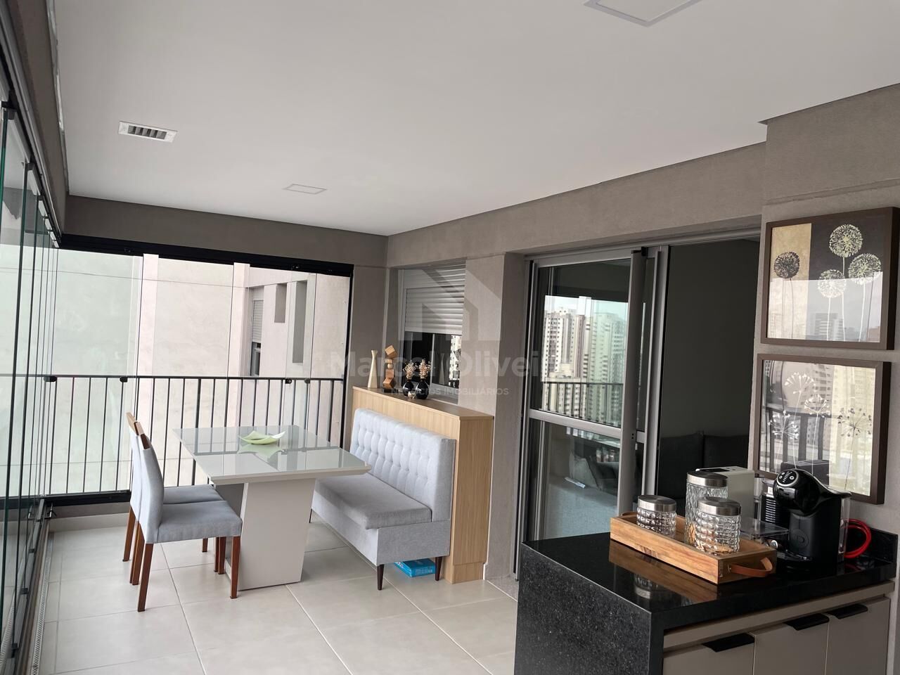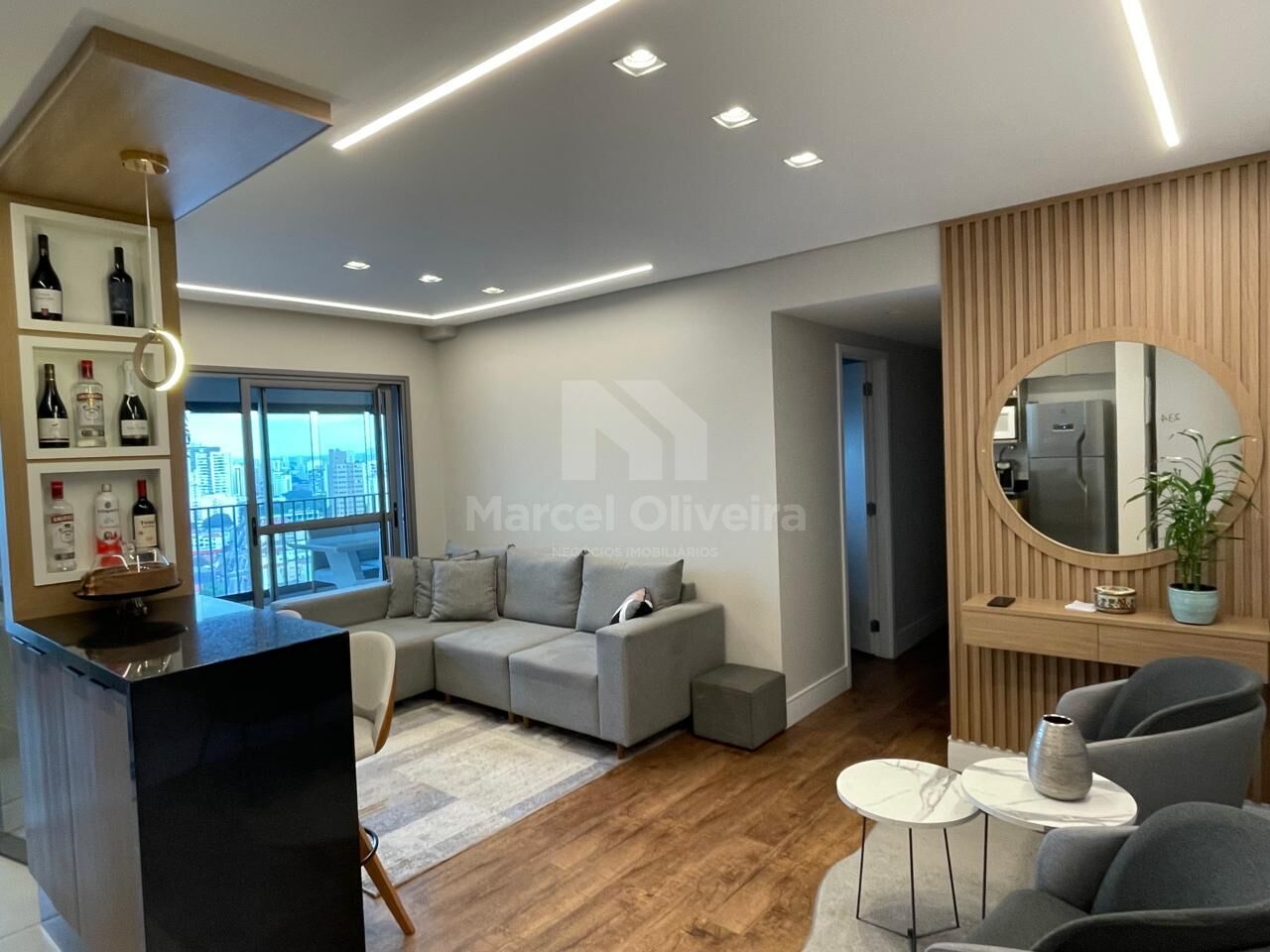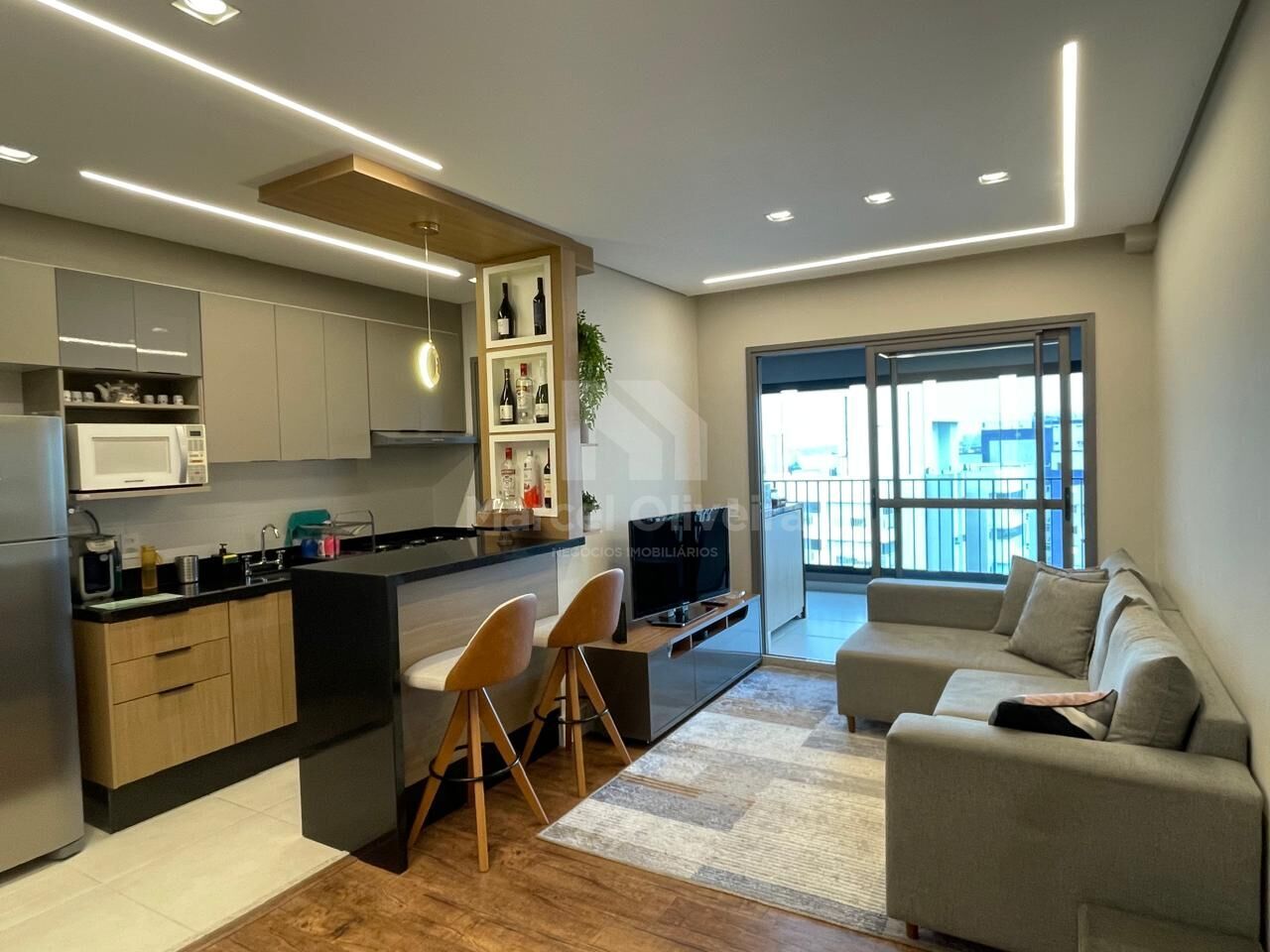 Esse apartamento conta com um excelente espaço de living com cozinha americana e varanda grill.